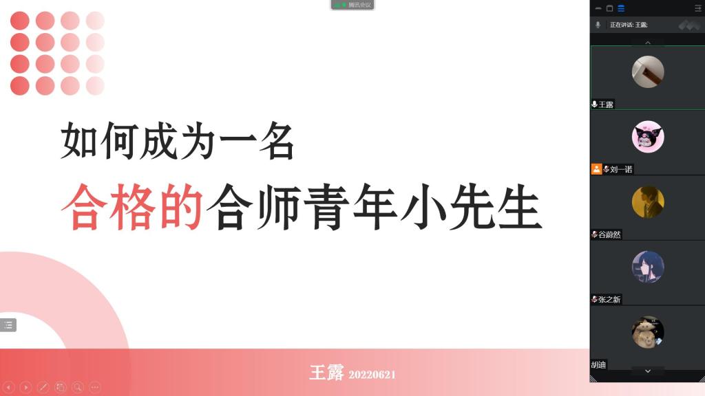 本网讯 6月22日,为更好地开展行知学堂志愿服务活动,深化行知学堂内涵建设,合师青年传媒中心(以下简称“合师青年”)依托腾讯会议于线上召开行知学堂小先生培训会。院团委思想宣传部负责人、合师青年指导教师王露,2021年铜陵义安行知学堂负责人、第十六届合师青年主任团成员葛正宇,2022年合师青年行知学堂全体小先生参加会议。