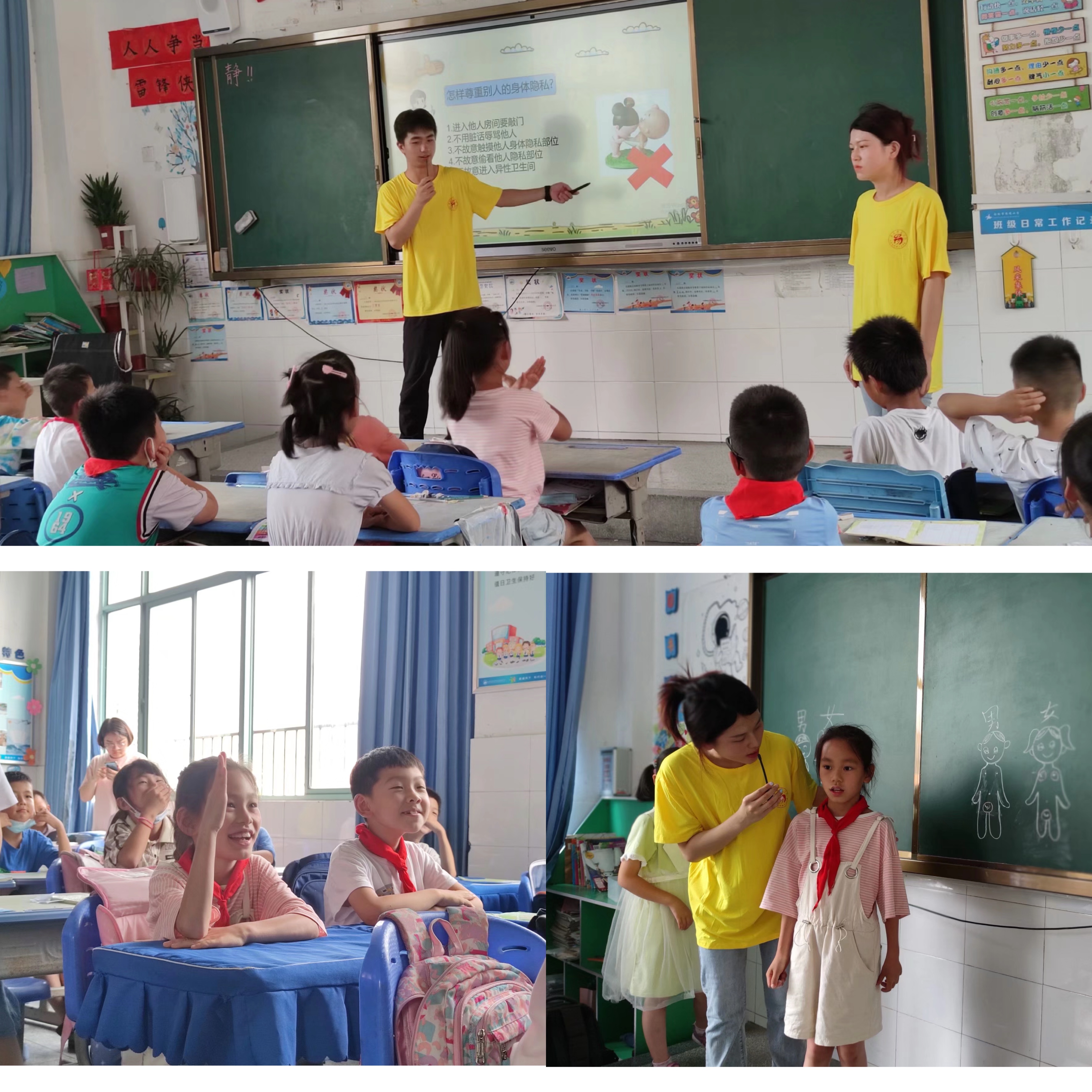 课程开始,队员们以“格物致知,科普创新——隐私部位我知道,自我保护我能行”为主题,开展了“实验—科普—教学—安全”为一体的课堂。队员们先通过PPT讲解了身体隐私部位的知识,并结合师生互动圈出隐私部位。最后,队员们和孩子们一起在黑板上通过绘画,交流讨论保护隐私的要点。活动过程中,孩子们通过一些生活中的事例和场景的辨析与判断,明白了如何保护隐私部位,树立“每个人都有自己身体的界限,要尊重别人的身体权利,同时也要保护好自己”的意识。