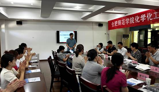 随后,中化学组教师代表鹿钰锋老师发言,他对实习生们的表现给予肯定,对各位实习生从树立信念、多反思总结等方面提出了建议,他表示好教师不是天生的,而是在教学管理实践中,在教育改革、发展中锻炼成长起来,希望同学们能“同心共践教育理念,且行且思不负韶华”!