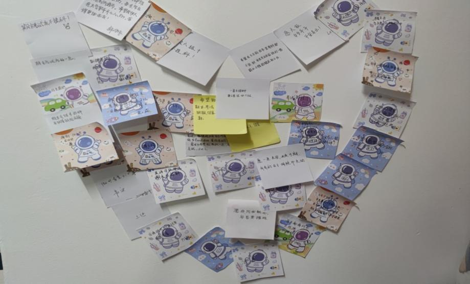 同学们纷纷在便利贴上写下自己的心愿,其中有对学业有成的期许,有对家人朋友的祝福,还有对当下自己的激励。随后,大家将“心愿便利贴”汇聚成爱心形状张贴在教室墙上,绽放爱的力量与光芒。