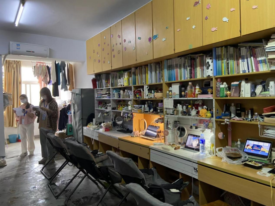 查寝过程中,查寝人员对发现的问题及时指出并帮助改正,例如:热水瓶要在固定地方摆放整齐,随意放在脚边有安全隐患;拖线板、充电线等不能放在床上等。并根据寝室卫生安全情况对每一项酌情打分。