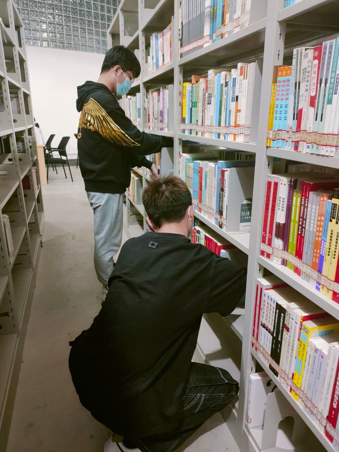 图书馆劳动中,同学们按照统一要求,整理书籍、打扫卫生,将每个角落都整理的干干净净。