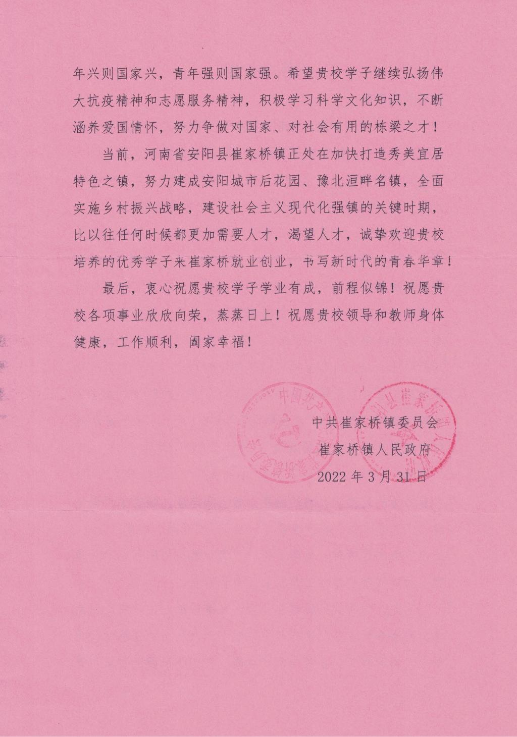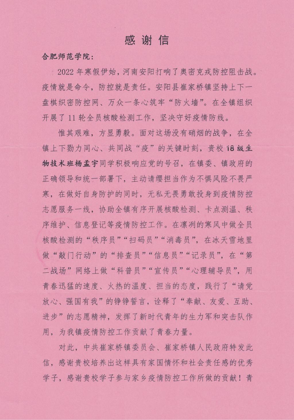 本网讯 近日,beat365在线唯一官网生命科学学院收到了来自河南省安阳县崔家桥镇的感谢信。信中对18级生物技术班杨孟宇同学不畏艰险、奋勇向前,积极投身家乡的疫情防控志愿服务表达了诚挚的感谢和崇高的敬意。