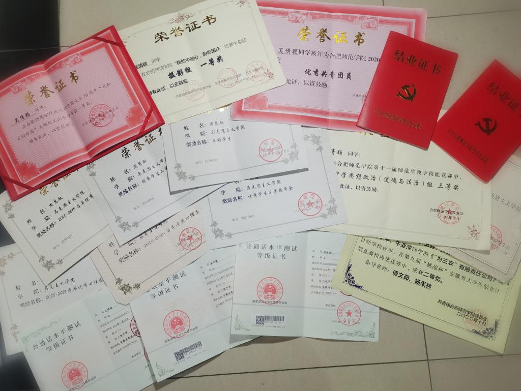 在校期间这四位同学也表现优秀,获得众多奖项。吴倩颖参加的大学生创业创新训练项目获国家级立项,同时也是优秀共青团员和心理委员,获得校二等奖学金和校征文比赛和摄影比赛一等奖。周慧敏获得过校二等奖学金和三等奖学金,校三好学生,以及优秀实习生荣誉。李明慧同学获得校三等奖学金和优秀共青团员。牛亚萍获得“挑战杯”安徽省大学生创业计划大赛二等奖,校三等奖学金。这些奖项固然不能充分证明这四位同学付出的全部努力,但从中也可以看出这四位女同学在学习和生活中的认真刻苦。