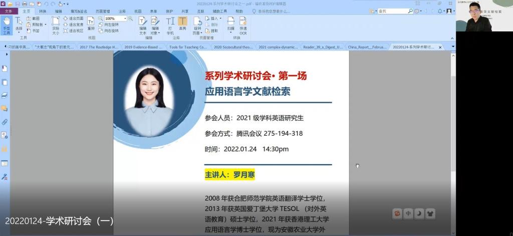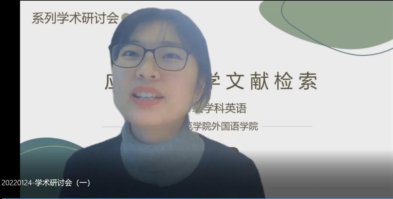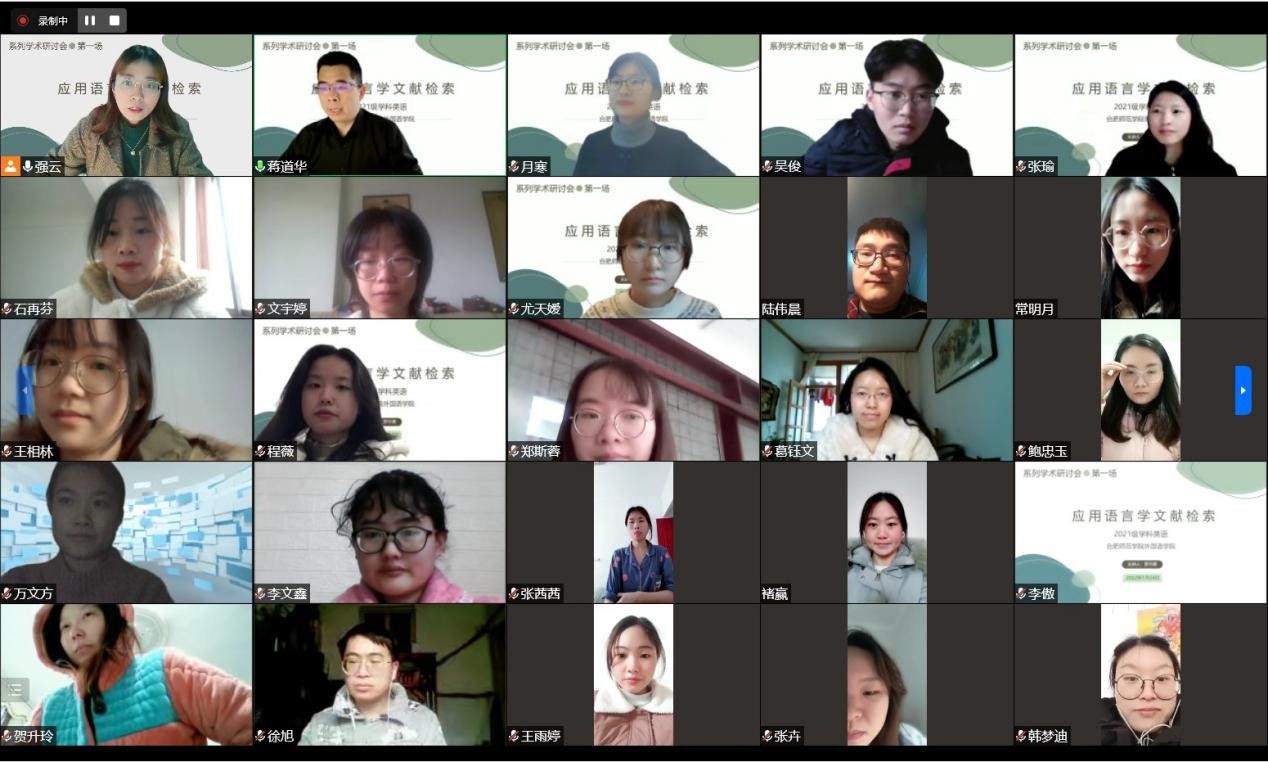 本网讯 为了不断提升外国语学院研究生培养质量,加强对研究生培养的过程性监督与督促,1月24日下午,在外国语学院研究生部的组织下,为2021级学科教学(英语)方向的研究生举行了一场线上学术研讨会,所有2021级研究生同学及部分2018级本科同学参与了本次线上研讨会。本次学术研讨会邀请了安徽农业大学外国语学院罗月寒博士作为主旨发言人,发言话题为“应用语言学文献检索”,外院研究生部主任蒋道华、研究生导师强云,吴礼敬参与了本次线上研讨。