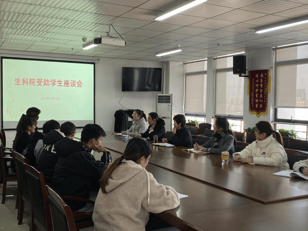 本网讯 临近新春,时至隆冬,为了能让家庭经济特别困难学生安心学习、认真备考、温暖过冬,12月21日下午,生命科学学院于行知楼1502会议室召开受助学生座谈会。生命科学学院党委书记郭桃芬、副书记杨娜、学院全体辅导员和7名特困生参加了会议。会议由杨娜主持。
