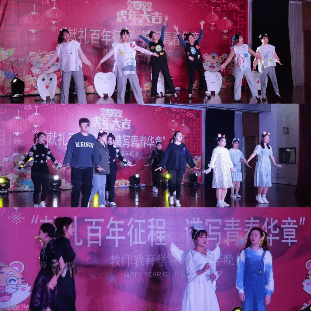 本场晚会为教师教育学院学子们全方位展示师范生技能提供了舞台。其间,教师教育学院合唱社团带来的《英雄赞歌》与《梨花又开放》,表达了同学们对英雄们的崇高敬仰,为大家展示了梨花漫天飞扬的美好故乡画面。空竹社团带来的《空竹展示秀》,弘扬了中国传统文化,高超的技术让台下的观众热血澎湃。穆娟、李群与王磊老师的朗诵《百年荣光》,回望了党波澜壮阔的百年征程,党带领着人民风雨兼程、砥砺前行,才成就了如今这百年的辉煌。作品诉说了对革命先烈们的敬佩、崇拜与感恩之情,表达了对党的无限热爱,将现场气氛推入了高潮。最终,在古典舞与拉丁舞结合的《我爱你中国》中本场晚会圆满落幕,现场所有师生一起合影留念。