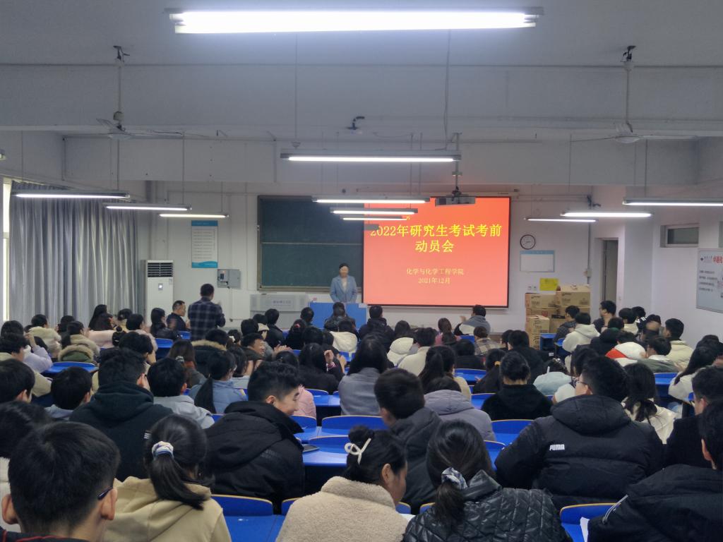 本网讯 为了更好地服务2022届毕业生考研,调整考生状态,12月16日,化学与化学工程学院召开2022年研究生考试考前动员会,学院党委书记李红、院长董华泽、副书记徐祝青、副院长朱金苗出席会议,2022届考研学生和辅导员张晖、王庆林参加。