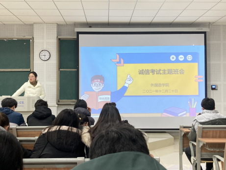 本网讯 为帮助学生明确诚信的重要意义,自觉做到诚信考试。12月20日晚,外国语学院在博学楼D101召开诚信考试主题班会,学院共有460余名学生分批参加此次主题班会,本次班会由辅导员冯晓敏主讲。