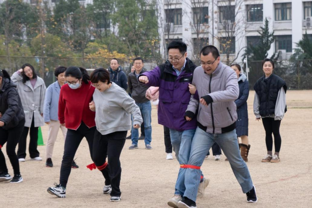 参加本次趣味运动会的为全体生科院教工和学生会干部,共设立四个比赛项目:拔河比赛、两人三足、抢板凳、背新娘。参赛队伍分别为生物技术教工队、食品质量与安全教工队、生物科学教工队、实验行政教工队和学生干部队。第一个比赛项目是拔河。当裁判哨声响起,参赛队员紧握长绳,拼尽全力向后拉,绳子中间的红飘带左右摇摆,在比赛进入胶着状态时,大家毫不退却,咬紧牙关,坚持到底。周围助威的师生热情高涨,恨不得亲自上场拉一把,加油声、呐喊声、欢笑声此起彼伏,现场气氛热烈、高潮不断,原本安静的操场瞬间沸腾起来。第二比赛项目是两人三足。一人左腿与另一人右腿的小腿用绳子绑上,每批次5支队伍,在观众们的加油欢呼声下,大家团结协作、争先恐后,一起奔跑到终点。第三比赛项目是抢板凳。每批次18人参加,大家随着欢快的音乐围着椅子转圈,音乐一停便开始争先抢坐在椅子上,一轮又一轮,气氛紧张又欢快。最终趣味运动会以背新娘为结尾,在师生的欢声笑语中拉下帷幕。