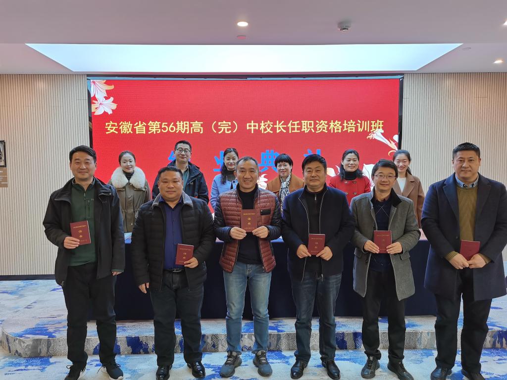本网讯 12月7日上午,教师教育学院承办的安徽省第56期高(完)中校长任职资格班在合肥市曼斯顿酒店举行了结业典礼。教师教育学院党委书记穆娟、院长李群、干训部主任胡连峰、班主任张珍珍,学生助理王艺舒以及来自全省各地73位校长班全体学员参加了结业典礼,典礼由胡连峰主持。