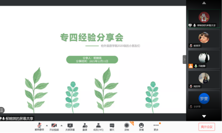 本网讯 为帮助学生掌握专业四级考试备考方法,明确学习任务和努力方向,11月11号—16号,外国语学院分别组织召开英语专业四级考试和西语专业四级考试线上经验分享会,共234名学生参加此次分享会,会议由2020级辅导员冯晓敏主持。