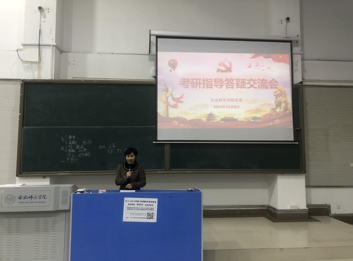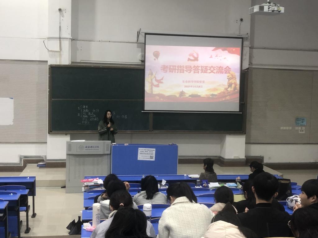 本网讯 为帮助毕业班考研学生解决实际问题,指导他们高效备战,缓解考前压力,提高成功率,进一步推动“为师生办实事”实践活动走深走实。11月8日中午,生命科学学院在逸夫楼西阶一教室开展毕业班考研指导答疑交流会。出席会议的有生命科学学院党委书记郭桃芬、副书记杨娜。指导答疑由教工党支部书记王占军、陈金武、方雪以及党员教师程诚、杨星星五位老师主讲。交流会由2018级辅导员杨帆主持,2018级一百余名学生参加。
