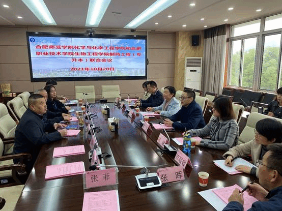 本网讯 10月20日,为进一步落实好联合培养单位本科生工作,化学与化学工程学院党委书记李红、院长董华泽、副院长朱金苗,制药工程系主任郑斌,部分教学及行政管理人员,前往合肥职业技术学院开展制药工程(专升本)本科生联合培养工作推进会。合肥职业技术学院生物工程学院书记汪春荣、院长刘修树、药学化学教研室主任范高福带领相关教职人员参会。