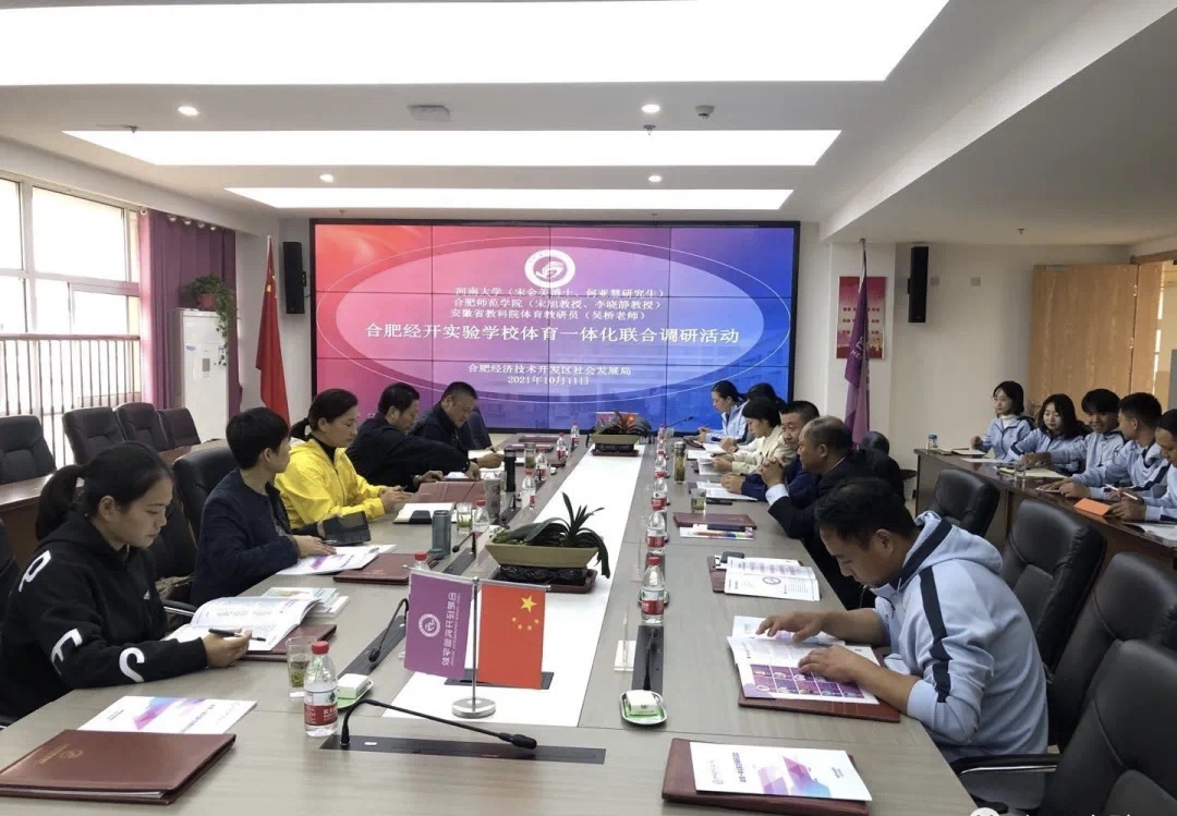 大课间活动结束,宋金美博士等围绕“合肥经开实验学校体育一体化走班教学实施情况及学校体育工作”开展交流研讨。邵忠德校长、刘洋副校长分别向与会人员介绍了合肥经开实验学校体育一体化推进情况和学校体育工作汇报。