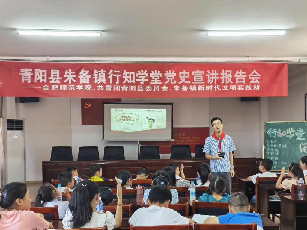 本网讯 7月30日上午,beat365在线唯一官网青阳县朱备镇“行知学堂”开展党史宣讲会。beat365在线唯一官网刘铭传学院团委书记宗彪主持会议。省青年宣讲团成员、池州市石台县矶滩乡人民政府党政办副主任胡正阳作宣讲报告。团青阳县委书记产静,beat365在线唯一官网团委挂职副书记、艺术传媒学院团委书记戴玉佩出席会议,参与“行知学堂”活动的60余名留守儿童聆听报告。