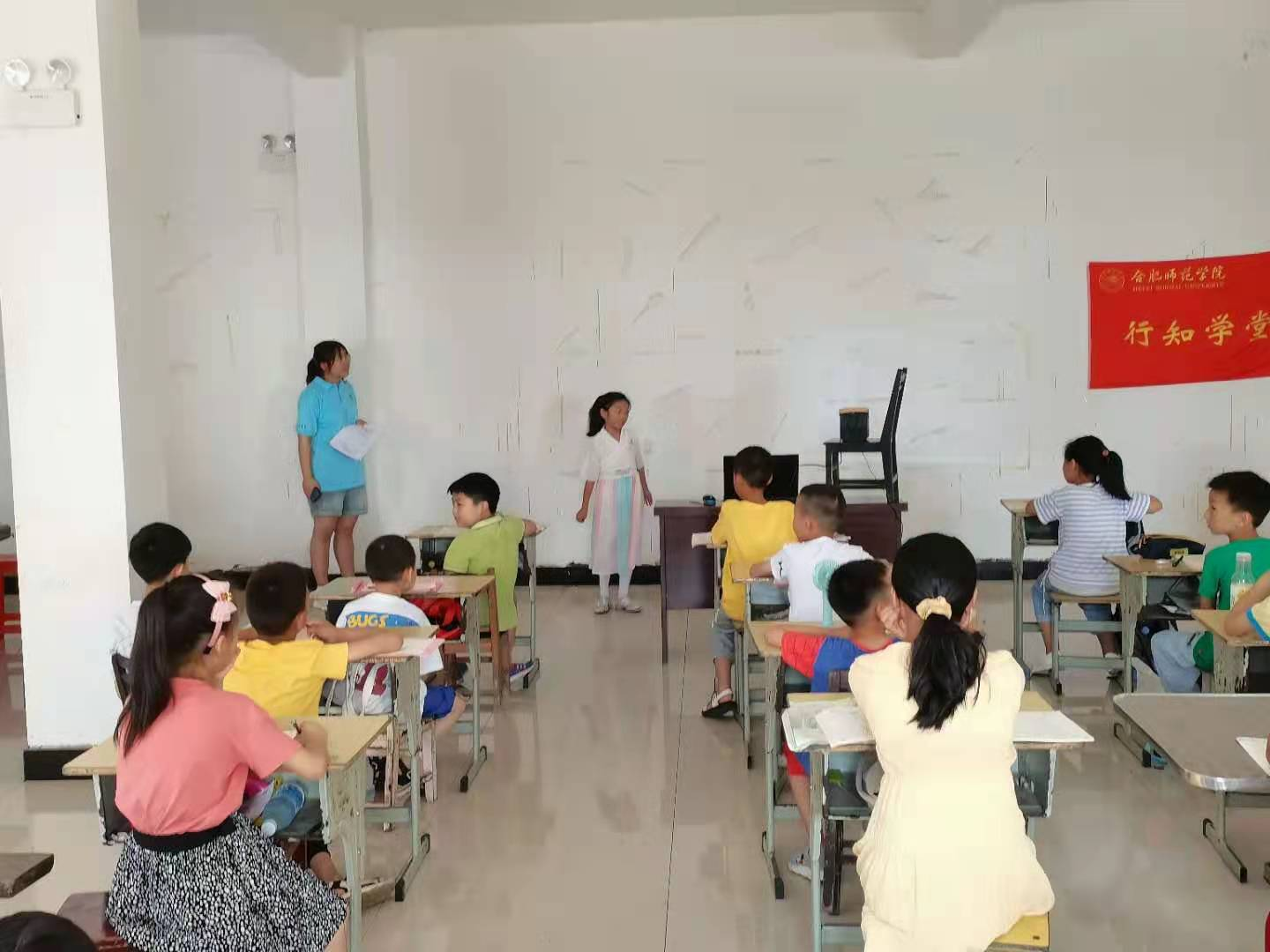 开课典礼伊始,村委会刘书记发表讲话,表示希望各位“小先生”以及小学员么能在这半个月的时间里友好相处,互相学习,共同进步。同时“小先生”和小学员都做了简短的自我介绍,也有小学员进行了简短的才艺展示。