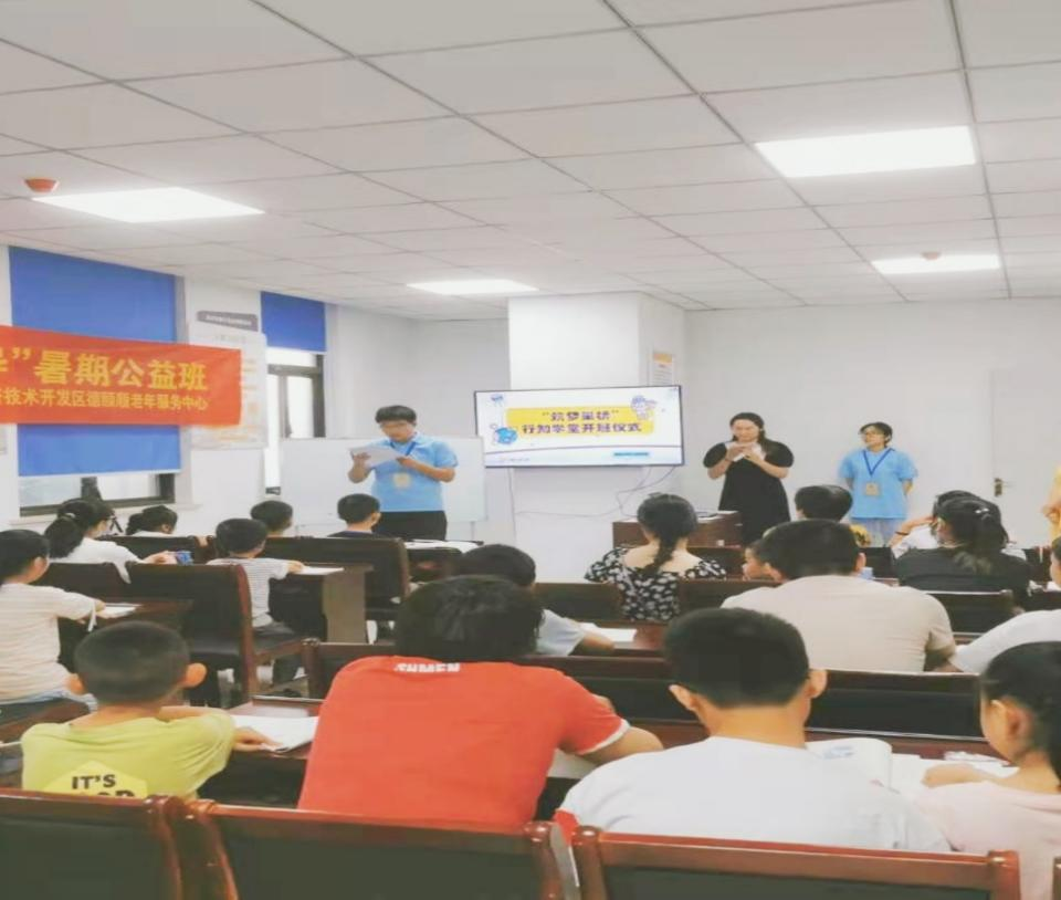 本网讯 为传承红色基因,服务留守儿童,共筑青春梦想,7月7日上午,物理与材料工程学院“筑梦巢桥”行知学堂在合肥市巢桥居委会正式开班。巢桥社区居委会副主任周玥、行知学堂指导老师吴梦云、7名行知学堂“小先生”以及近30名小学生及家长参加了开班仪式。