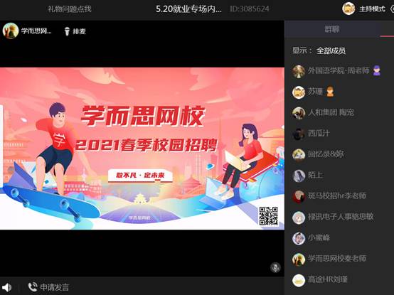本网讯 为贯彻落实党中央、国务院“稳就业”“保就业”决策部署,按照教育部、省教育厅有关工作要求和学校2021届本科毕业生就业促进周活动方案安排,更加精准地搭建中小企业与所需专业人才的对接平台,5月20日下午2点,由就业创业工作处主办,数学与统计学院、外国语学院承办的“520空中就业宣讲招聘会”活动以线上形式顺利举办。