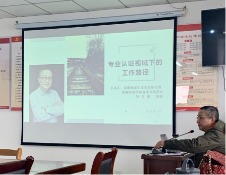 本网讯 为促进音乐学院师范类专业认证工作有效开展,进一步深化学院教师对师范专业认证工作的认识,加强专业建设,落实师范类专业人才培养目标,切实提高师范类人才培养质量,4月7日下午,音乐学院院长罗可曼教授在行知楼1602会议室作了“专业认证视域下的工作路径”专题讲座。音乐学院全体教师参加本场讲座,学院副院长李劲松主持讲座。