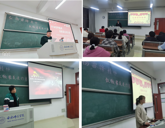 分处滨湖、锦绣校区的各班级开展“为教室、宿舍加点料”志愿服务活动,对自习室和宿舍楼进行清洁。围绕“雷锋的生平事迹”和“雷锋精神的意义”召开主题班会,引导帮助同学们正确看待雷锋精神,弘扬雷锋精神和雷锋作风。开展“传承雷锋薪火”为主题的演讲比赛,同学们紧扣主题,从生活、学习和思想启迪等方面畅谈自己对雷锋精神的理解,真切表达他们自觉践行雷锋精神的信念和决心。