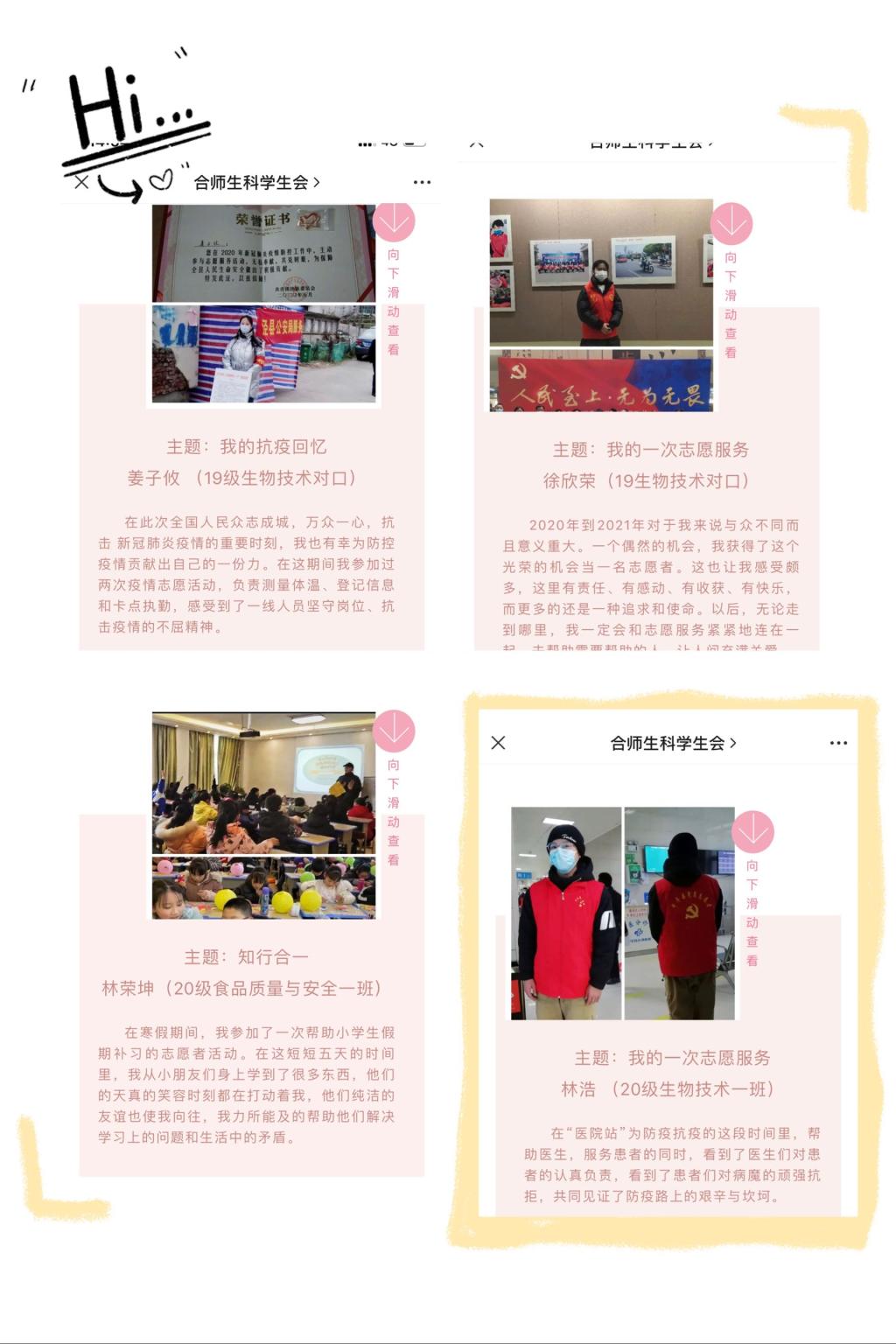 “青春新征程,奉献十四五”。为弘扬和践行社会主义核心价值观,勠力同心抗击疫情,寒假期间,生命科学学院学子纷纷参与志愿服务活动,尽情展现青年大学生靓丽风采。林浩同学深入医院,帮助医院维持秩序,为患者提供热心服务;徐欣荣同学走进无为县图书馆,介绍防疫抗洪英雄的英勇事迹;姜子攸同学选择守卫在家乡的村口,与工作人员共同守护着家乡;林荣坤同学走进课堂,成为一名“小先生”,教书育人,关爱留守儿童。