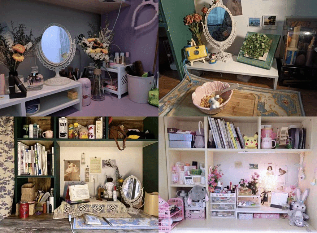 女生寝室的同学们精心布置属于自己的小角落,充满浓厚的艺术风格,同学们的桌面整洁干净,无不彰显出她们对美的向往。其中,3栋B216和3栋B122两个寝室利用干花、复古妆镜以及一些精致的小摆件进行美观的摆放,整体看起来更加的复古精致,使人具有更美的观感。3栋B120寝室 桌面以深色为主色调,彰显复古风格,充满艺术格调。利用贴纸、小物件来装饰自己的桌子,每一个角落都流露出寝室成员对生活的热爱。