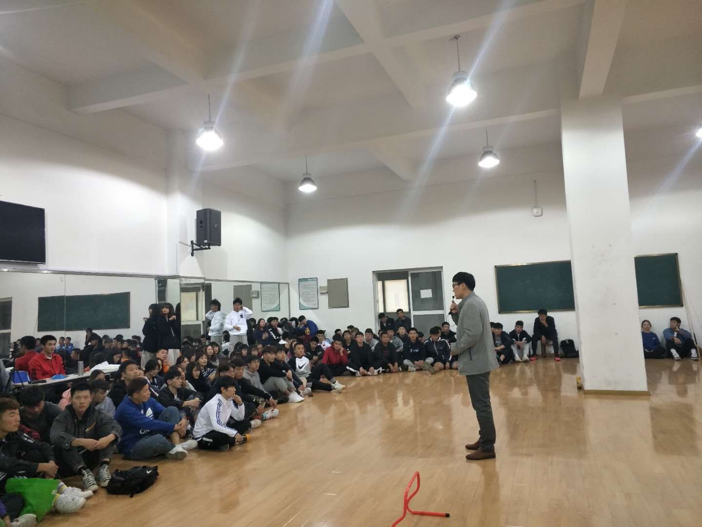 本网讯 为进一步加强运动训练专业学生教学技能培养,提高学生的教育教学能力,搭建教学相长的交流平台。11月2日,在锦绣校区体育馆二楼舞蹈房,体育科学学院运动训练系组织开展“无生上课”实践活动,邀请曹垚和王金晶两位老师,石可、杨涛和舒敏三位学生主讲,运动训练系汪辉老师、廖顺建和陆保云老师及全体学生参加,其中,17级和18级学生现场观摩,19级和20级通过线上直播观摩。运动训练系主任游永豪副教授主持。