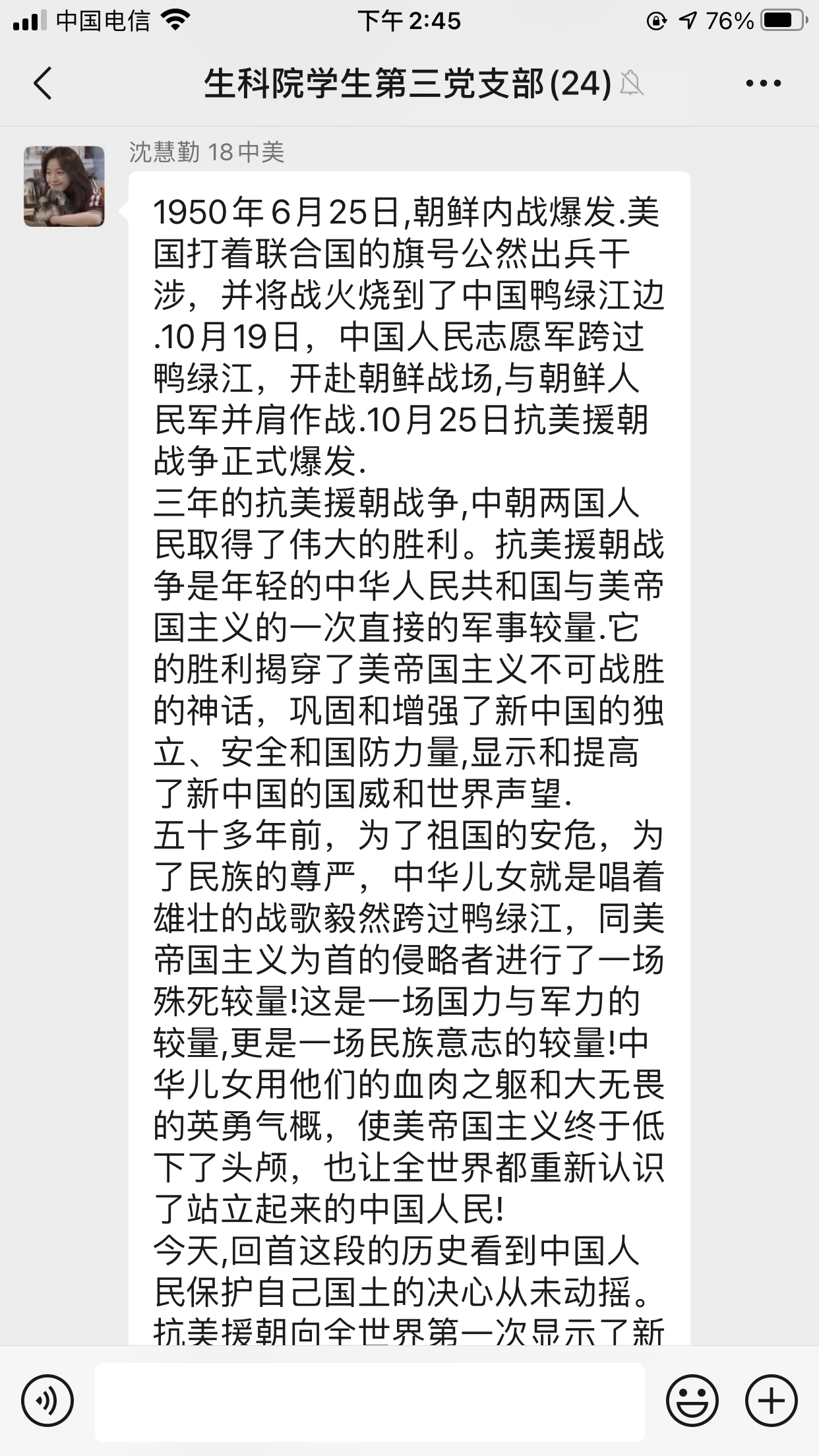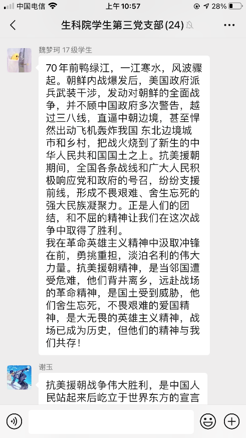 其他党员同学也都纷纷表示,一定要铭记抗美援朝战争的艰辛历程和伟大胜利,继承好、弘扬好伟大抗美援朝精神,不断砥砺民族风骨、汇聚民族力量、锻造民族血性、激发民族智慧,立足岗位,扎实工作和学习,为实现中华民族伟大复兴而努力奋斗。(生命科学学院:李万成)