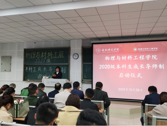 本网讯 10月28日下午,物理与材料工程学院在滨湖校区博学楼D101举行了简短而又隆重的拜师仪式,正式启动2020级本科生成长导师制。学院全体教师和2020级新生参加仪式。启动仪式由党总支副书记吴震主持。