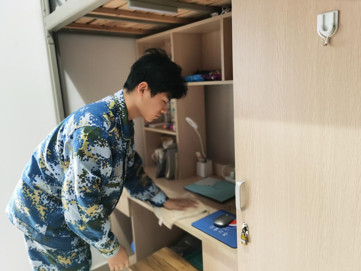 军训除了室外训练,也有室内的教学。教官耐心负责地讲授军事知识,同学们专心致志地听讲,恶劣的天气阻挠不了同学们对学习的热情。与此同时,男寝开展内务整理活动。教官悉心指导同学们的寝室内务工作,同学们认真整理、耐心受教,一上午的成果令同学们笑在嘴上,乐在心头。