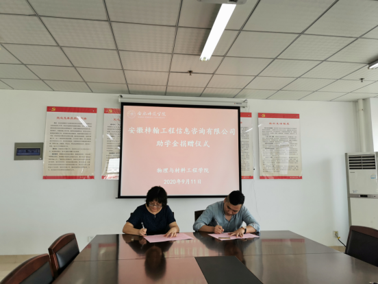 仪式上,胡毅和李大创分别介绍了捐助企业和学院的相关情况。胡毅和唐洁分别代表安徽梓翰信息工程咨询有限公司和物理与材料工程学院签订了捐赠协议书。