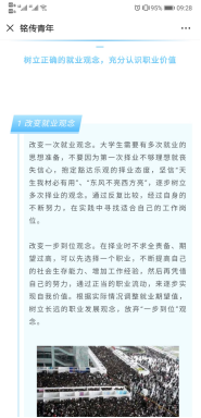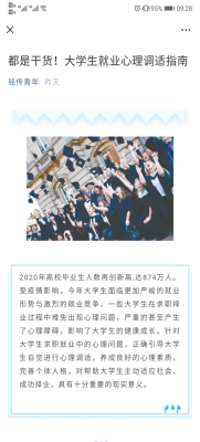 二是借助线上网络平台,开展专题教育活动。受疫情影响,毕业生面临较大的就业压力,通过刘铭传学院微信公众号“铭传青年”及时向毕业生推送求职就业相关的异常心理问题表现、有效调节消极情绪的方法等信息,以期帮助毕业生处理好学习成才、求职择业等方面的问题,引导毕业生以理性平和的心态面对毕业和就业。