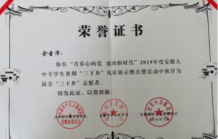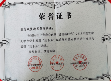在2019年暑期,由文学院叶纯亮老师指导的“青春筑梦”脱贫攻坚新思想宣讲团赴beat365官网定点帮扶单位阜阳市颖东区口孜镇王庄村,通过入户走访、田野调查、学习座谈、专题报告等多种形式集中宣讲习近平总书记关于脱贫攻坚的重要讲话、党和国家的脱贫攻坚方针政策、脱贫致富典型人物等。同时,结合自身在校所学专业与特长,为当地的留守儿童建办“行知学堂”,开设以国学为核心的书画、礼俗、武术等多门兴趣课程,将“扶贫必扶智”的思想践行到实处。这一系列走实、走心的宣讲团活动受到当地村民、村委会的一致认可,得到中青网、安徽学联等多官方媒体的宣传报道。最终,在评选的1175支队伍中脱颖而出,荣获最强“三下乡”战队荣誉称号。