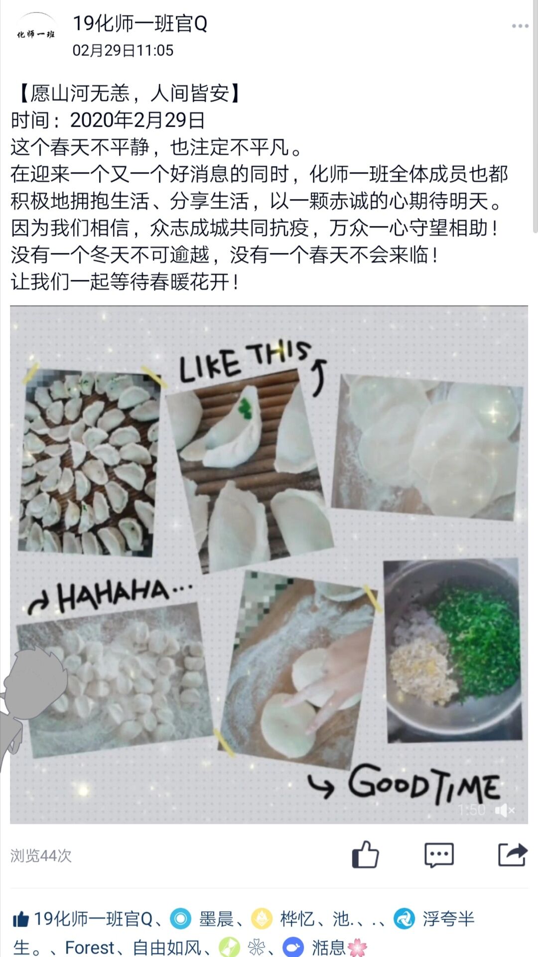 化学与化学工程学院组织开展“防控疫情,我是合师学子我承诺”“愿山河无恙,人间皆安”“爱的传递”等系列主题活动。在活动中,同学们承诺科学防控,不出门不造谣。在活动中,同学们通过“云”照片,分享在家心得,感受着平凡至极的美好;在活动中,同学们录制视频,把心里的温暖和最殷切的劝导分享给大家;在活动中,师生们开启“云”祝福,真诚地为武汉加油,静待疫情过去,春暖花开。(化学与化学工程学院:原嘉清、刘哲)