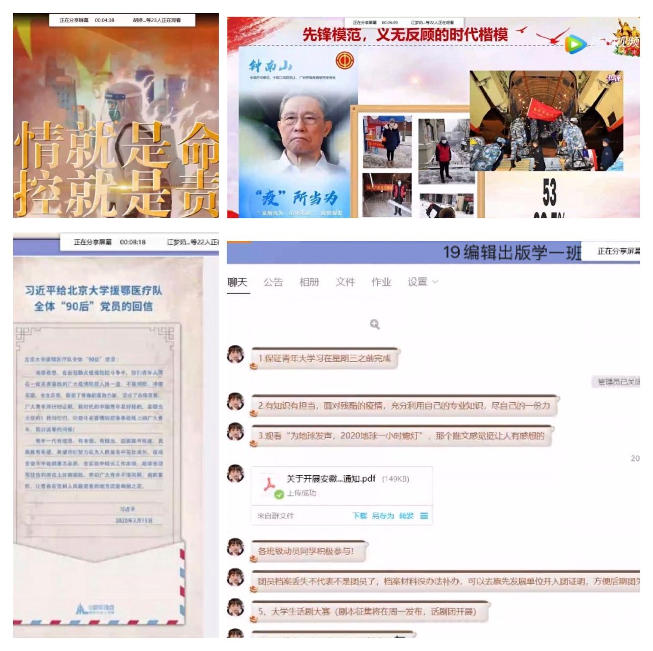 2019级编辑1班团支部通过线上主题班会的形式,团支书以“努力成为有理想有担当的社会主义青年”为主题,通过QQ直播课堂想同学们分享了讲话精神的原文,并组织了班级同学研讨。