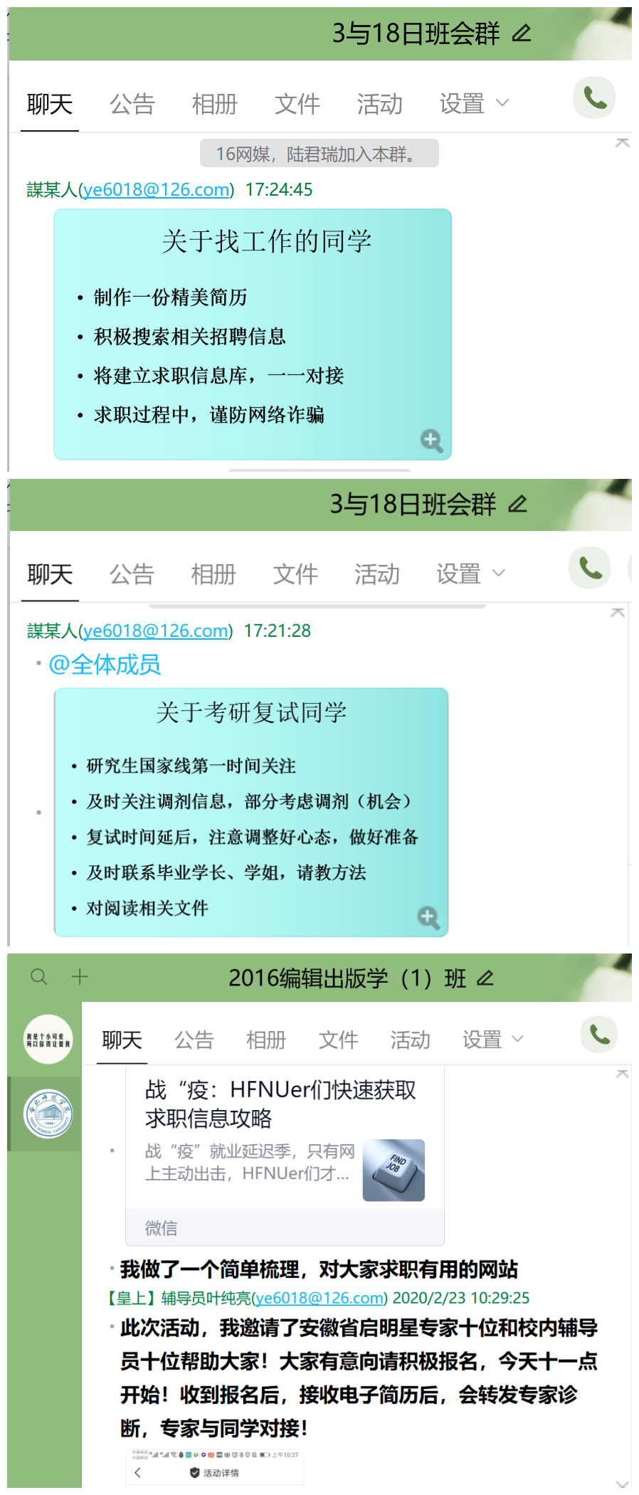 三是聚焦学业发展。针对不同学生特点和工作重点,各年级召开内容丰富多样,切合自身实际的主题班会。班会内容既有引导学生端正学风,保质保量完成线上学习任务的谆谆教导,也有重点分析当前就业形势和就业工作的变化特点,帮助同学们利用网络应聘投简历的贴心服务。
