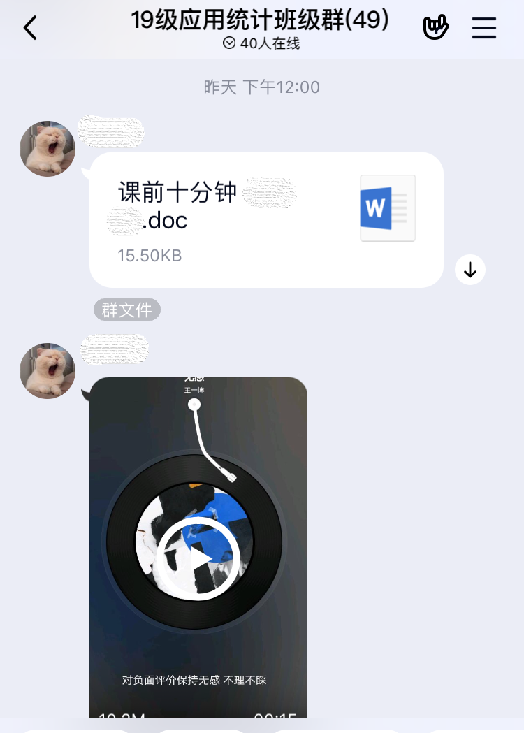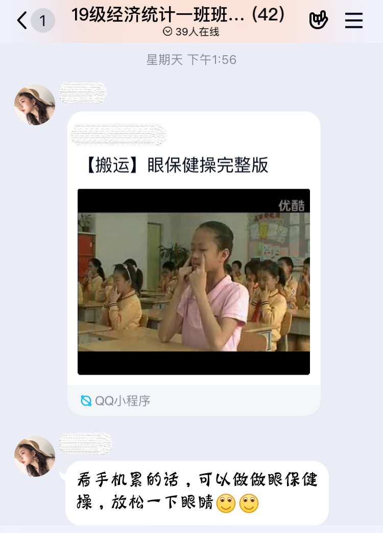 “我分享”,通过班级官Q、班级群等平台,推送一些好的文章、电影、音乐,陶冶同学们的情操。2019级应用统计班开展线上分享活动,分享好音乐、好电影、好文章,让学生们即使在家也能感受到来自班级同学的相互鼓励。
