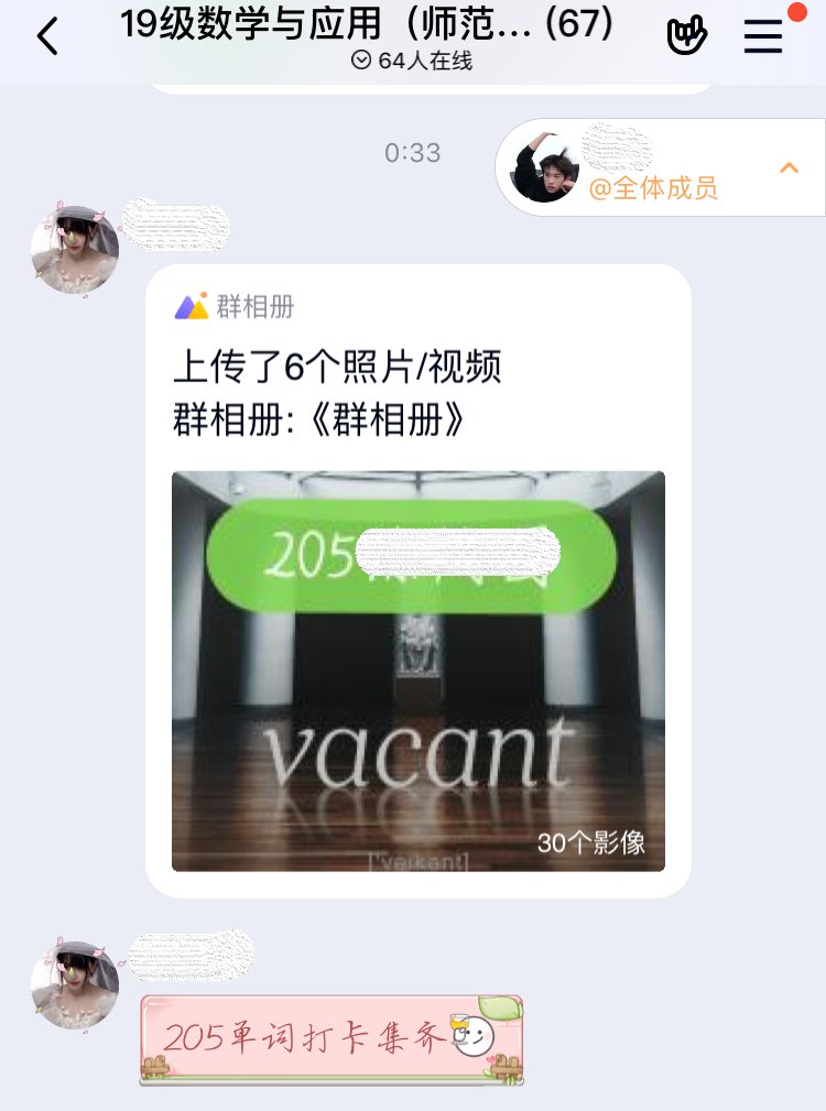 “我学习”,通过线上的学习分享,促进班级同学的交流。学生们可以分享自己在家的学习内容及心得,从而提高班级的整体学习氛围。2019级数学与应用数学师范二班组织开展每日练书法活动,既提高自身的师范生技能,又能在班级群里相互交流。数学与应用数学师范一班则组织开展每日英语打卡活动。提高班级同学的英语水平,为今年的英语四六级考试做充分的准备,提高班级英语四六级的通过率。