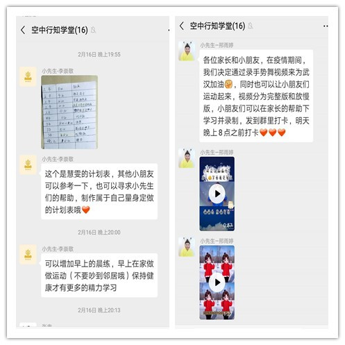 李崇敬小先生为小朋友们准备了对应的学习资料,任静小先生和孙思雨小先生为小朋友们找了适合的科普视频,小先生程亓和马梦琦通过手工视频打卡任务的发布让小朋友们活动起来,提高动手能力。小先生邢雨婷、陈钰格则负责手指舞的打卡。小先生们分工明确,既对自己的小朋友负责,也督促着其他小朋友的进步。