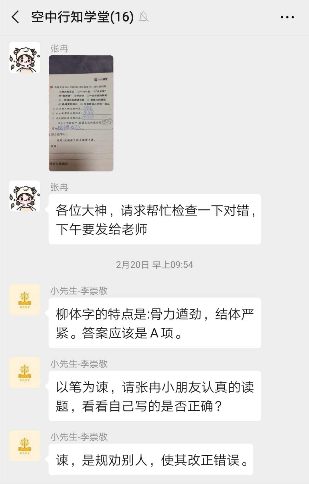 小朋友也将写完的作业发给小先生检查,小先生们仔细查看,将错误一个个挑出,耐心回复。