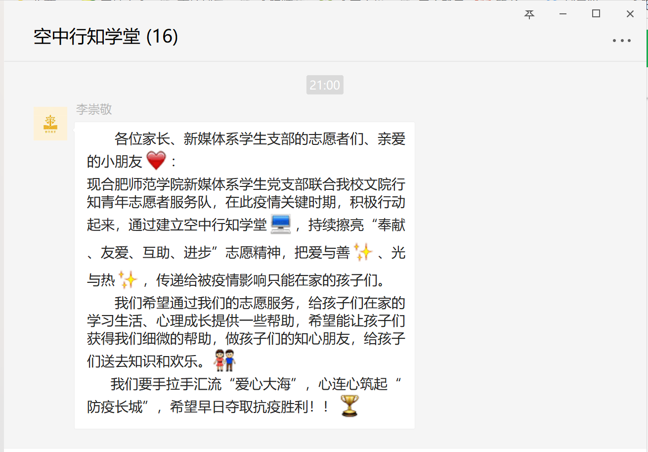 “现招募‘空中行知学院’志愿者,愿意参加的同学请回复。”新媒体系学生支部预备党员李崇敬在志愿者群内发完这条消息后,不到一分钟的时间,志愿者便招募完毕,同学们的热情出乎意料。