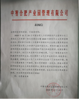 本网讯 11月23日,在中国合肥人力资源服务产业园举办了“长三角地区人力资源一体化发展论坛暨2019年高校毕业生秋季招聘会”以及全国人力资源市场高校毕业生就业服务周启动仪式和中国合肥人力资源产业园开园仪式,外国语学院60余名志愿者们积极奉献,耐心周到的服务,得到了中智合肥产业园管理有限公司的表扬。