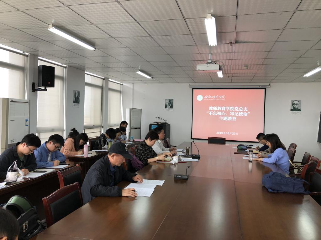 本网讯 10月23日下午,教师教育学院党总支召开全体教职工党员会议,开展“不忘初心、牢记使命”主题教育学习检测活动,会议由党总支副书记王东明主持,全体教职工党员参加了会议。