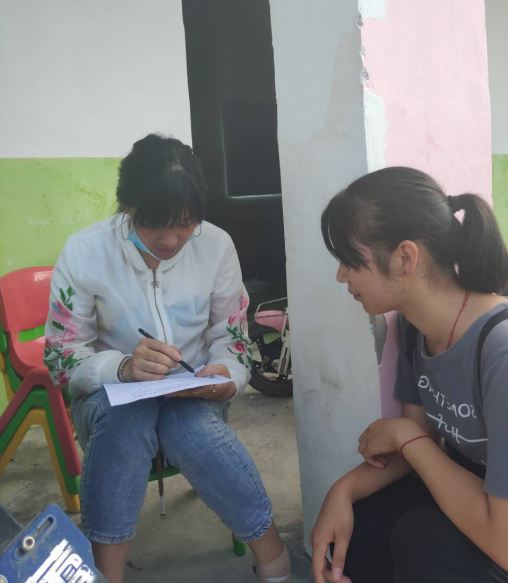 8月2日,活动正式开始,团队分散为两人一小组,深入淮南市潘集区夹沟镇、高皇镇、曹庵镇老圩村等地点,每组携带60-70份问卷挨家挨户敲门,将问卷发放到每个家长手中。本次问卷调查共设置14个小问题,家长们积极配合、认真填写,成员认真解答家长疑惑、及时记录,一定程度上了解了家长对孩子英语教育的重视程度。