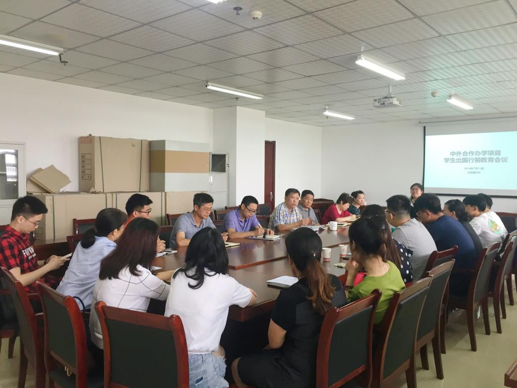 本网讯 7月11日下午,国际交流与合作处在行知楼308会议室举行了2019年中外合作办学项目学生出国留学行前教育会。国际交流与合作处处长张宇翔教授、经济与管理学院党总支书记沈辉老师、教师教育学院院长李群教授、化学与化学工程学院院长董华泽教授、生命科学学院院长徐忠东教授出席会议,中外合作办学项目学生及家长等参加了会议。会议由张宇翔主持。