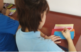 本网讯 7月22日,计算机学院黟县溪下村“行知学堂”开展了一堂有意义的手工课。溪下村是位于黄山市黟县的一个小山村,这里的孩子们大多数都是留守儿童,他们并不善于将自己的心里话表达出来。看着他们一张张虽年幼但如此懂事的面庞,“小先生”们决定为他们搭起一个说出心里话的平台,即“信封寄情”活动。