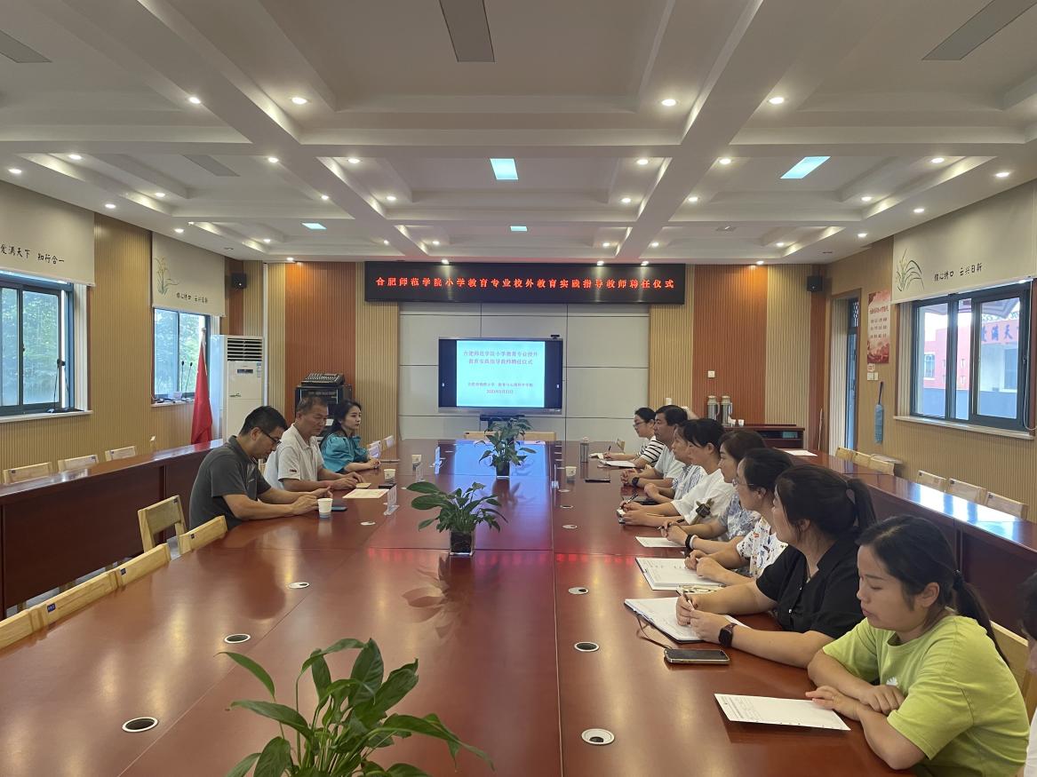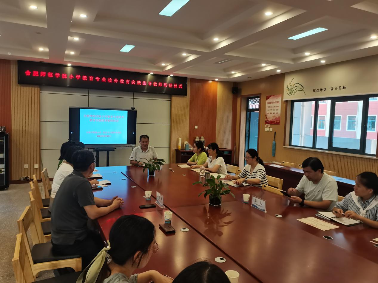 本网讯 8月23日下午,教育与心理科学学院副院长闫龙、副院长胡连峰、教育系副主任唐银等一行三人赴beat365在线唯一官网附属小学开展小学教育专业校外教育实践指导教师聘任仪式及培训会。beat365在线唯一官网附小校长彭正、学生处主任史迎春以及受聘的15位指导老师出席聘任仪式及培训会。