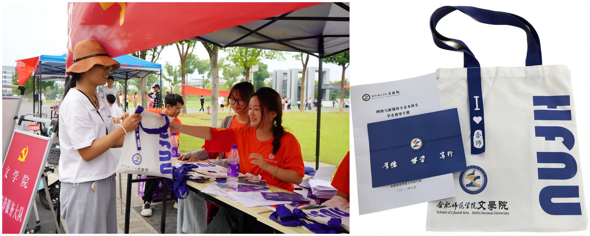文学院新媒体工作室设计的印有文学院logo的文创帆布袋,成为学生、家长最受欢迎的“新生礼”,包中“学生指导手册”,让“成长”成为迎新的第一课。