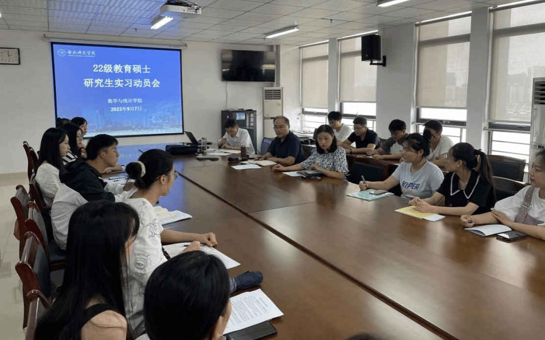 本网讯 为做好2022级研究生教育实习工作,9月7日,数学与统计学院在行知楼1102会议室召开教育硕士研究生实习动员大会,会议由沈南山主持。学院党委书记穆娟,副院长杨刘,教学秘书刘莲,辅导员杨尔飞及2022级42名研究生参加会议。